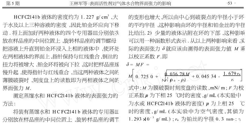 【摘要】:表面活性剂能够减小液体的表面张力以及两相液体间的界面张力,界面张力的减小有利于促进气体水合物快速形成和提高水合物储气能力.为定量研究两相液体间界面张力对气体水合物形成的影响,用界面张力仪实测不同温度时蒸馏水、HCFC-141b的表面张力以及HCFC-141b/蒸馏水、HCFC-141b/十二烷基硫酸钠溶液(0.247%)、HCFC-141b/十二烷基磺酸钠溶液(0.245%)、HCFC-141b/十二烷基苯磺酸钠溶液(0.057 6%)的界面张力,测试结果表明,表面活性剂对降低两相液体间界面张力的作用十分明显,其中十二烷基苯磺酸钠溶液对降低界面张力最为突出,降到HCFC-141b/蒸馏水界面张力值的9%左右,为定量研究气体水合物等优选表面活性剂提供了科学的依据。