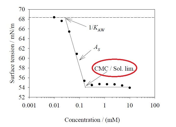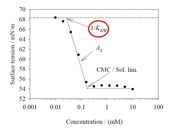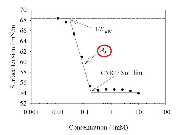 化合物分子定向和折叠决定了极性和非极性基团之间的对抗和平衡,通过真正表面积TSA(=每个吸附分子的平均面积)来反映。表面积来源于吸附等温线,即在表面饱和的表面过剩浓度(最大吸附值)。